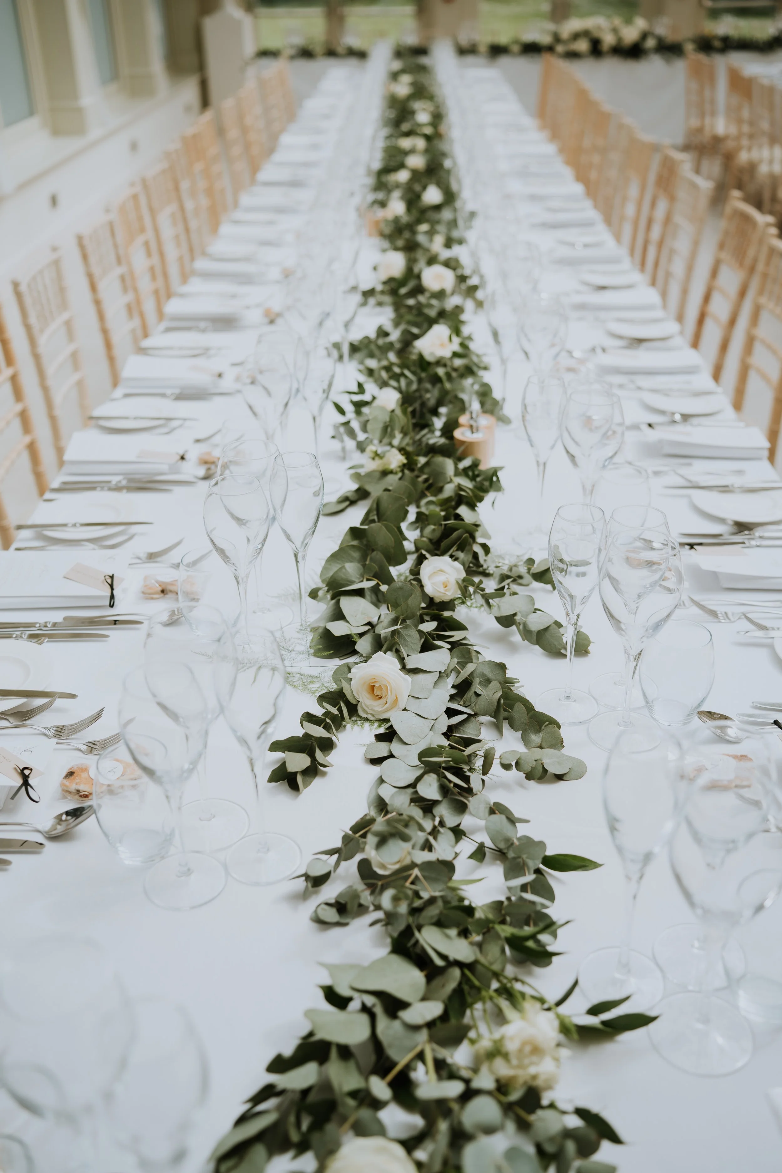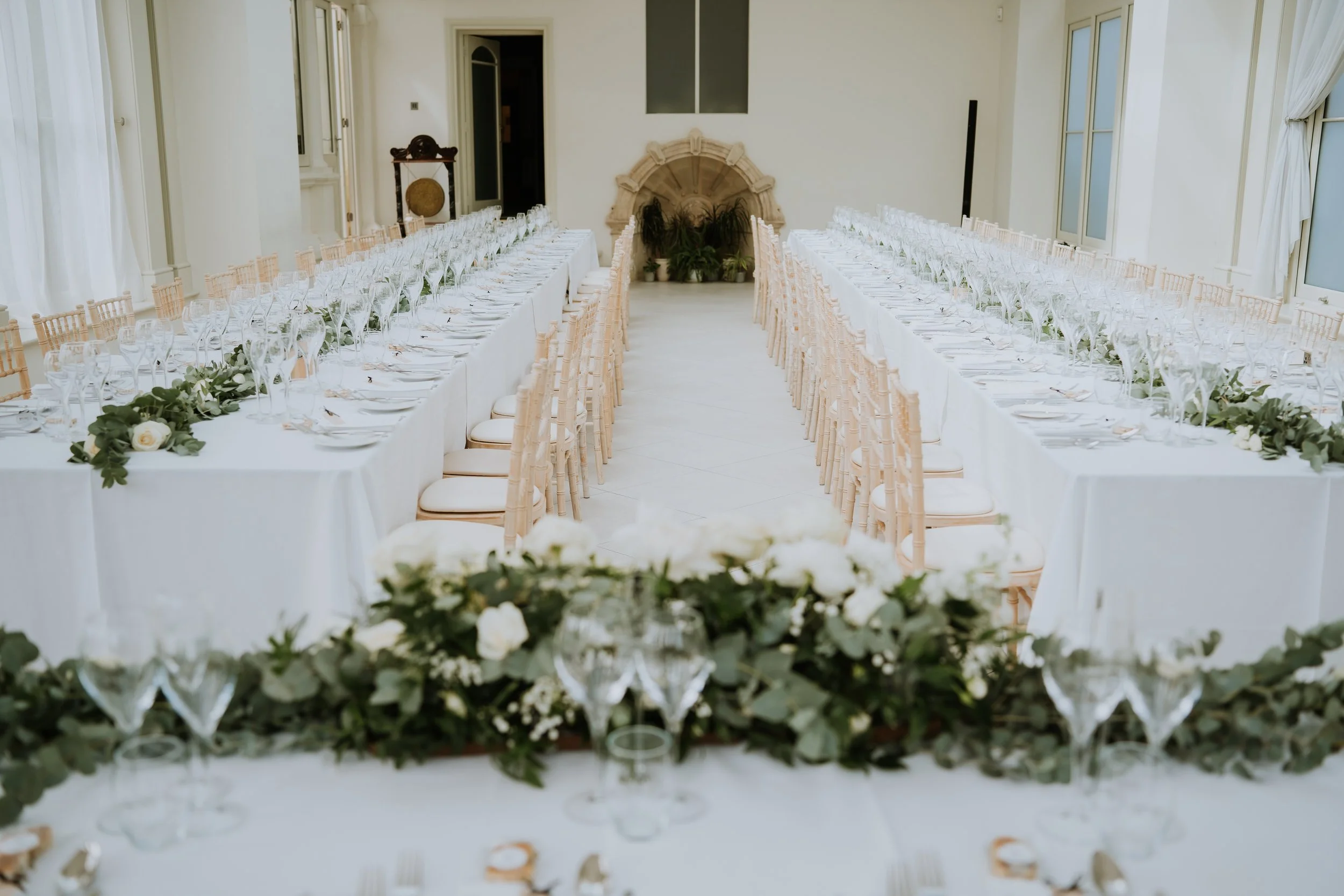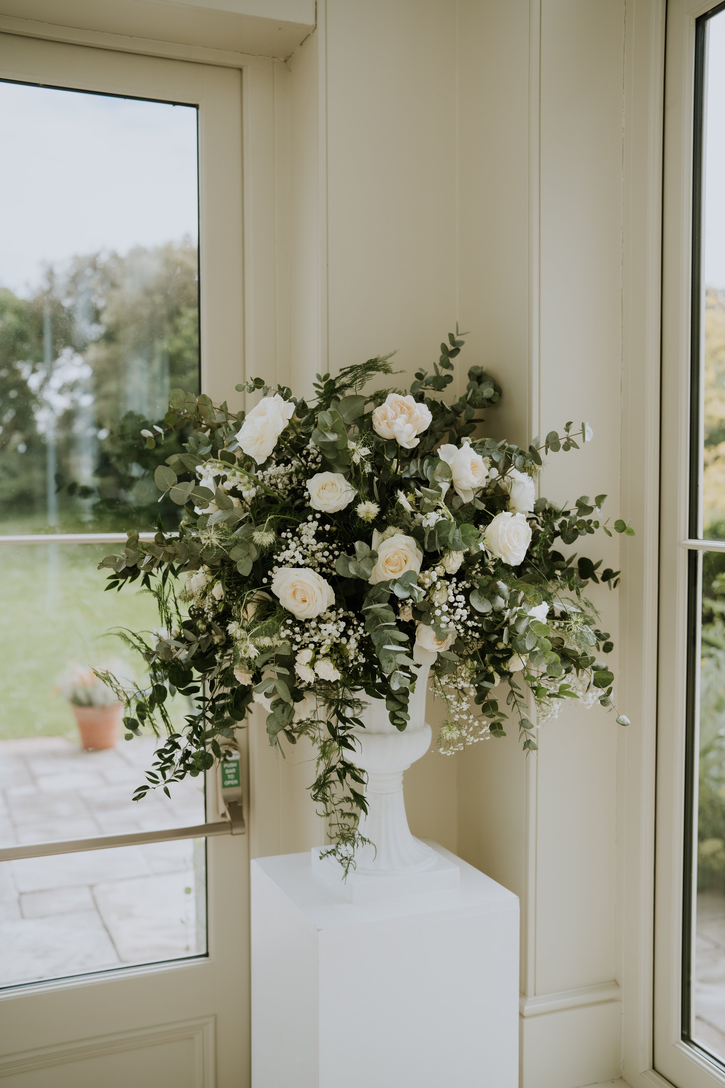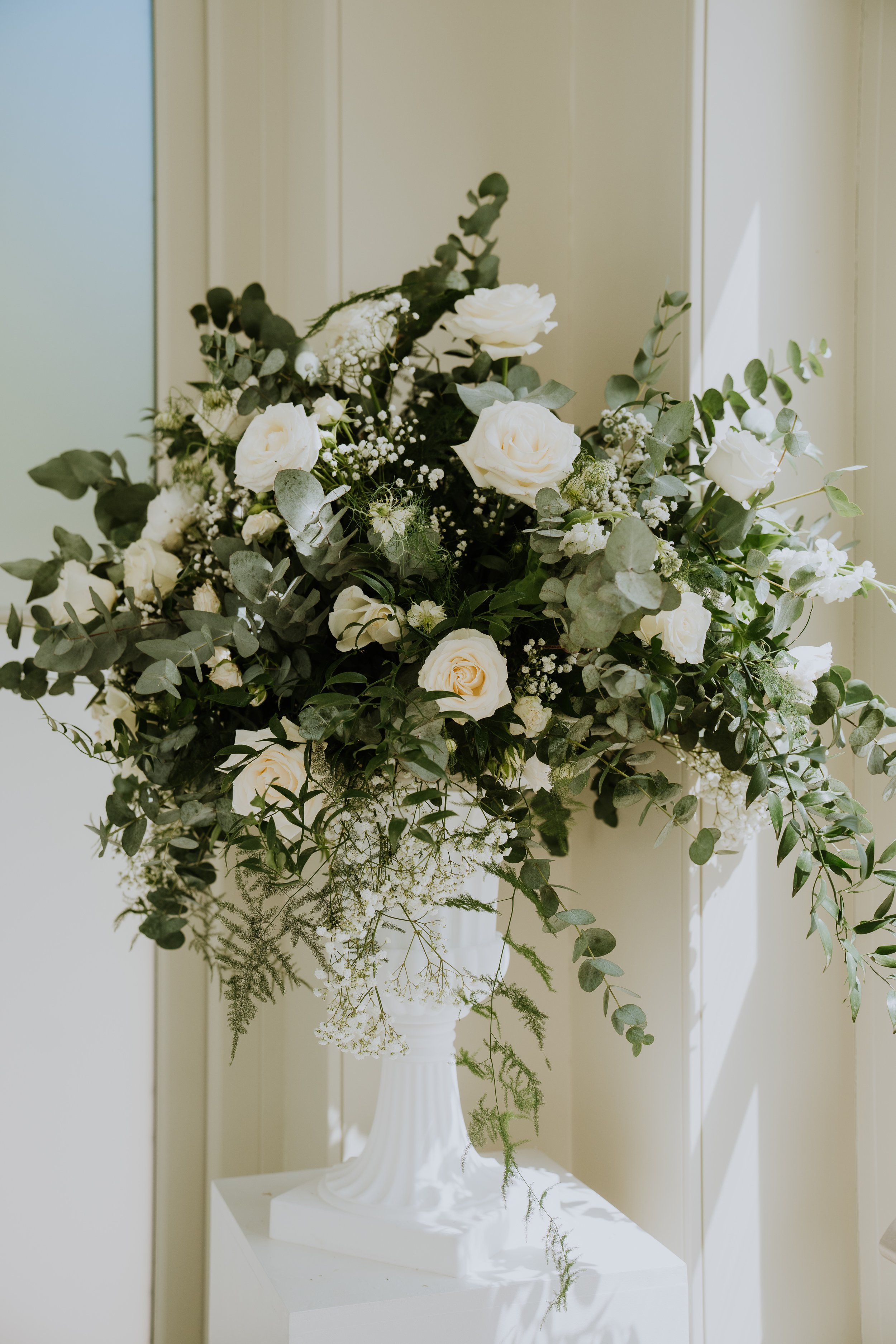 Floral highlights included statement urn arrangements for the ceremony, moved to the Wedding Breakfast along with a long, trailing table runners of greenery and matching flowers — adding a sense of natural movement and refined simplicity. Every bloom was chosen to complement the setting, resulting in a celebration that felt both classic and effortlessly beautiful.
