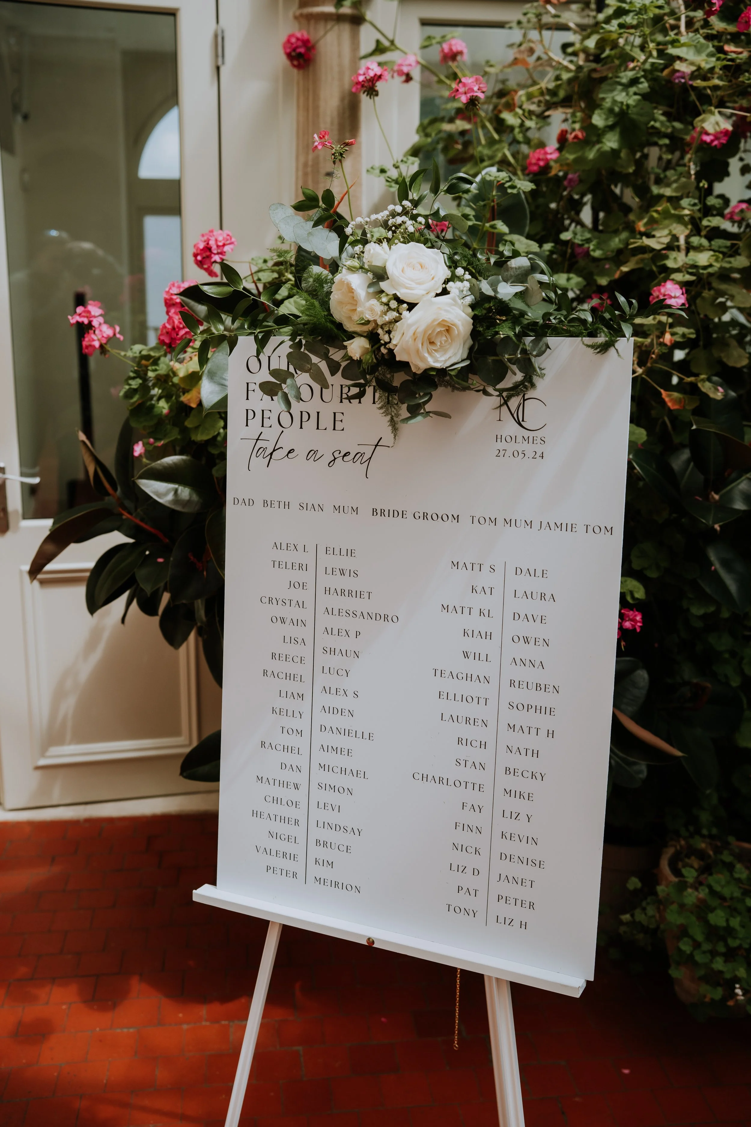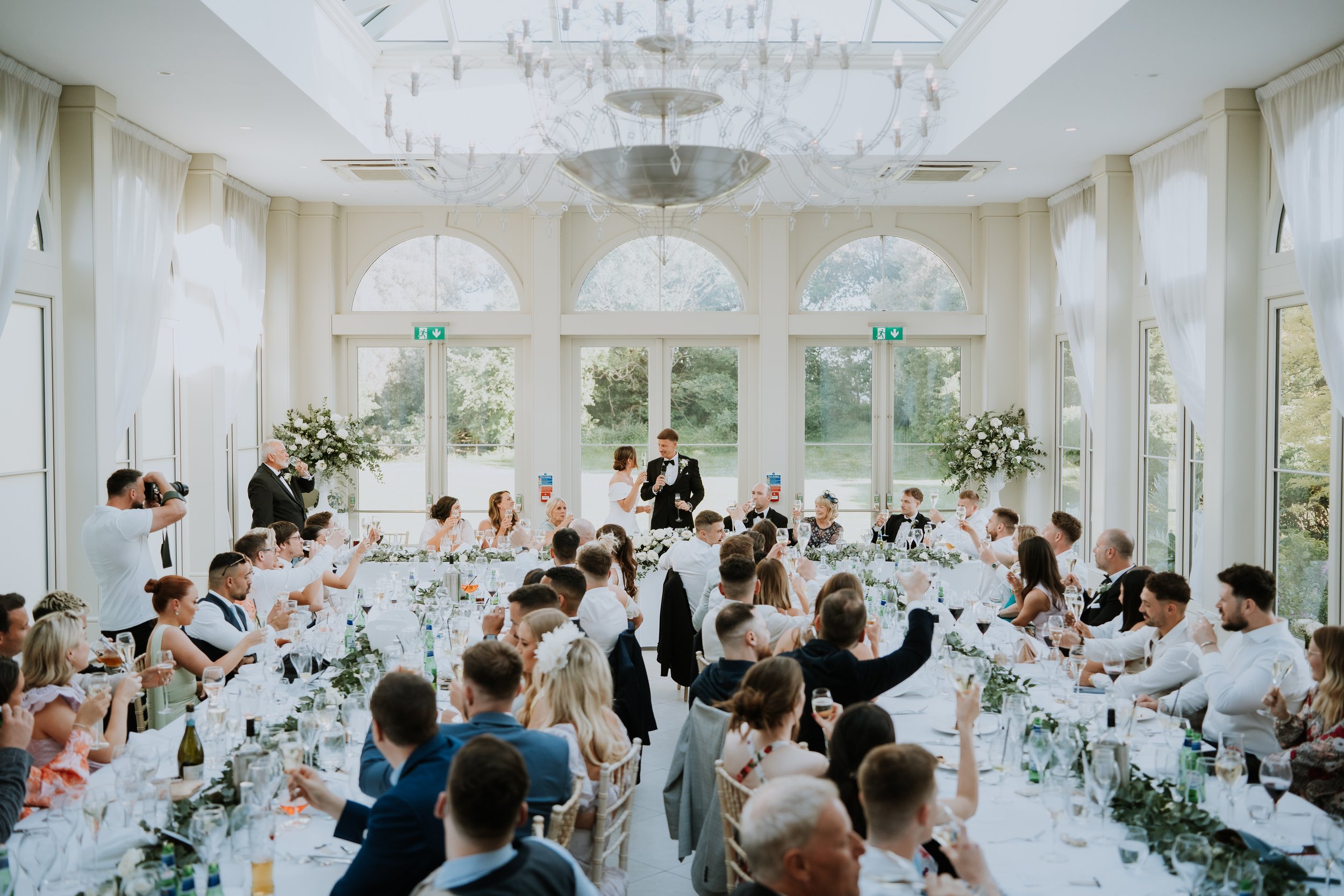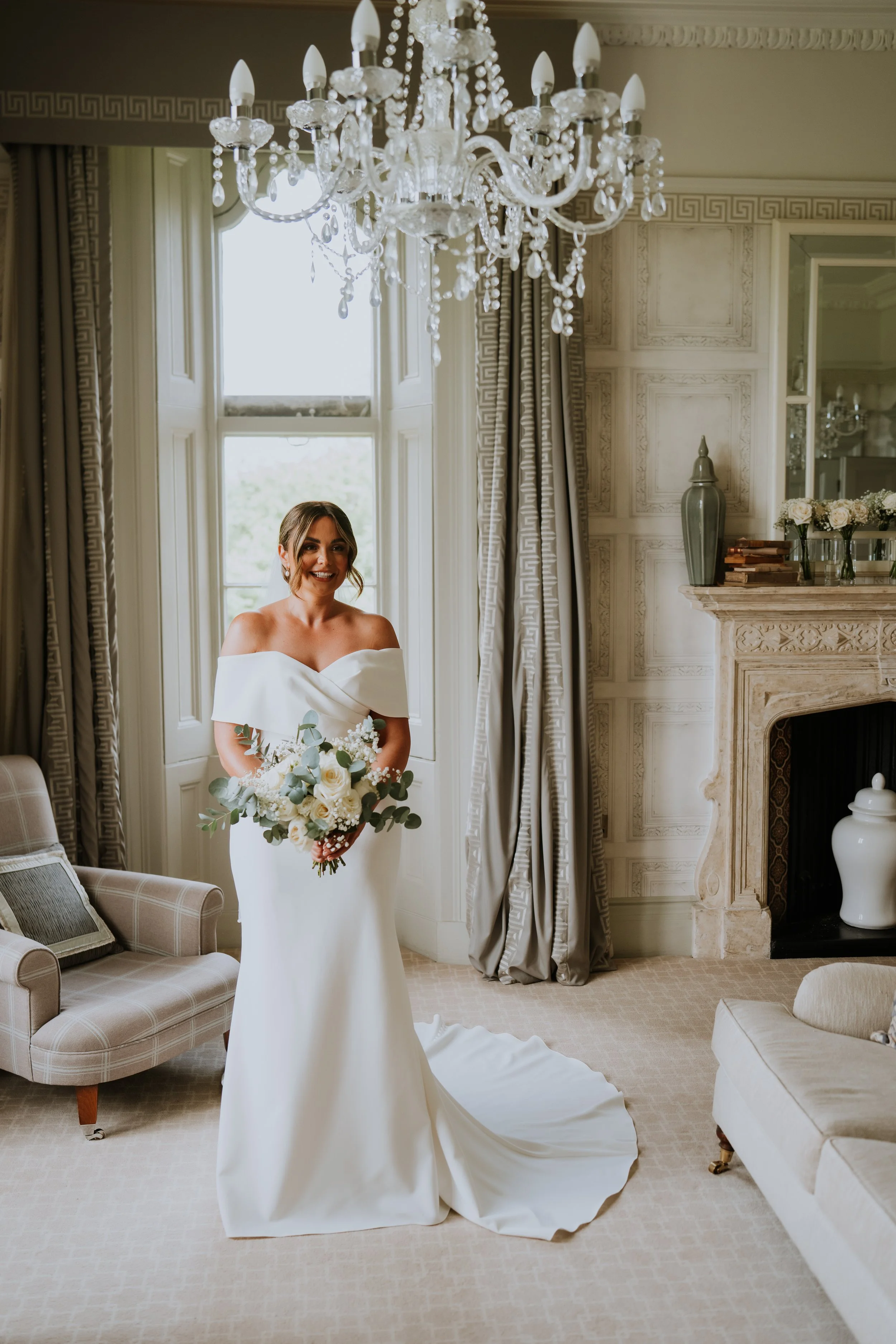 Floral highlights included statement urn arrangements for the ceremony, moved to the Wedding Breakfast along with a long, trailing table runners of greenery and matching flowers — adding a sense of natural movement and refined simplicity. Every bloom was chosen to complement the setting, resulting in a celebration that felt both classic and effortlessly beautiful.